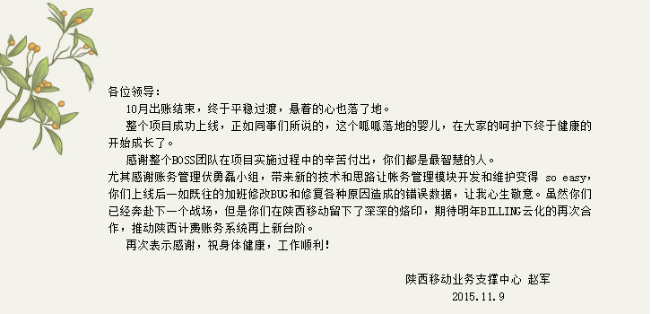 金秋十月,这是一个收获的季节。陕西移动云化项目顺利上线,随之而来的是陕西移动局方赵军赵总写给我们陕西移动CRM云化项目组的一封感谢信,这就是秋天的收获,是我们项目组的收获,也是我们自己的收获。